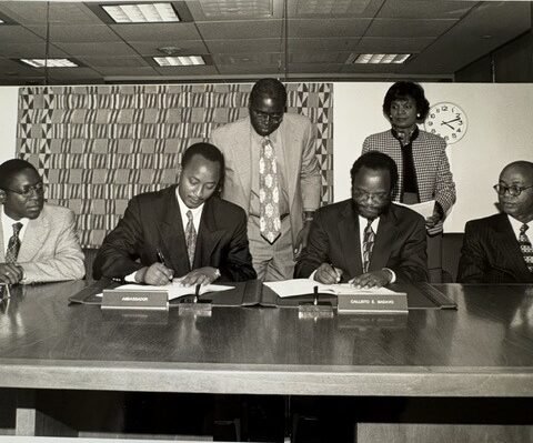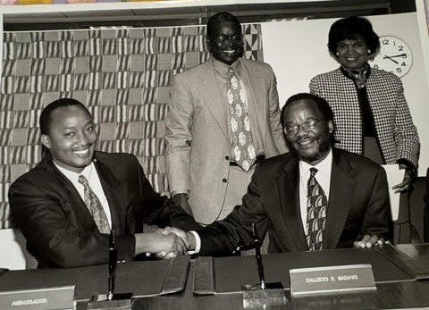 Signing for the first World Bank credit of $ 50 million, with then World Bank VP Callixto Madavo, 1996.